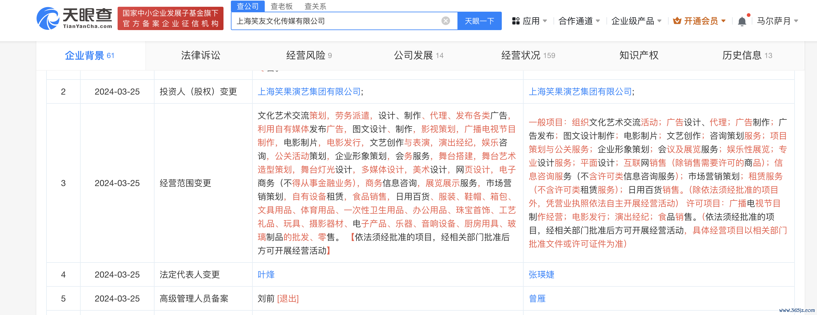 天眼查App显露,近日,上海笑友文化传媒有限公司发生工商变更,笑果文化首创东说念主叶烽卸任该公功令定代表东说念主及实行董事,由张瑛婕接任。